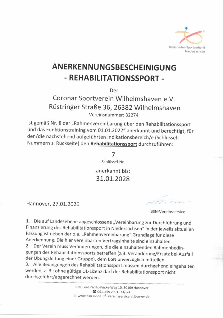 Coronar Sportverein Wilhelmshaven e.V., Rüstringer Str. 36, 26382 Wilhelmshaven